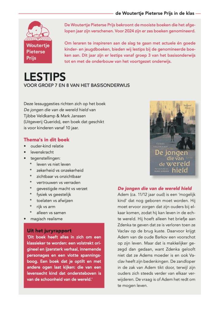 Deze lestips (pdf) richten zich op het boek De jongen die van de wereld hield van Tjibbe Veldkamp en Mark Janssen (Uitgeverij Querido), een boek dat geschikt is voor kinderen vanaf 10 jaar. Deze lestips zijn bedoeld voor groep 7 en 8 van het basisonderwijs.
