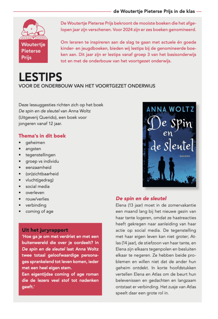 Deze lestips (pdf) richten zich op het boek De spin en de sleutel van Anna Woltz (Uitgeverij Querido), een boek dat geschikt is voor kinderen vanaf 12 jaar. Deze lestips zijn bedoeld voor de onderbouw van het voortgezet onderwijs.