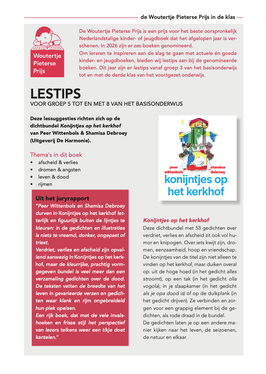 De Woutertje Pieterse Prijs bekroont de mooiste boeken die het afgelopen jaar zijn verschenen. In 2026 zijn zes boeken genomineerd. Deze lestips (pdf) richten zich op het boek Konijntjes op het kerkhof van Peer Wittenbols en Shamisa Debroey, boek dat geschikt is lezers vanaf 7 jaar. Deze lestips zijn bedoeld voor groep 5 tot en met 8 van het basisonderwijs.